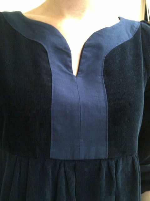 Taille 7 sans marges de couture, avec diminution des jupes devant et dos d’au moins 10 cm au milieu (pourtant je l’ai cousu en novembre 2010, deux mois avant la naissance de Joséphine, le bébé-géant). J’avais cousu la parementure d’encolure sans difficulté (pourtant j’étais grande débutante)grâce à ce tuto en images dont je ne remercierai jamais assez l’auteur.