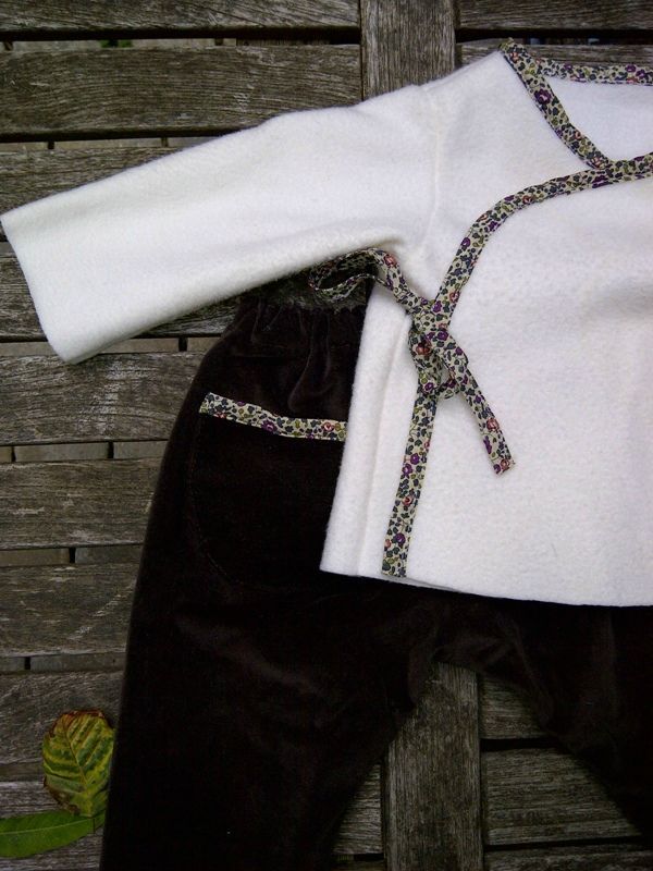 Avant de le remiser dans un carton (je sais je suis en retard, cela fait seulement quatre mois que sa propriétaire ne rentre plus dedans), voici un petit ensemble que j’avais cousu pour Joséphine, composé d’un cache-coeur des intemporels pour bébé, et d’un pantalon à taille élastiquée du même livre.